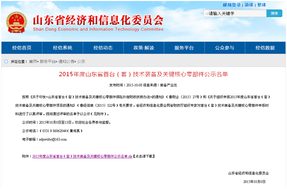 2015年度山東省首臺(套)技術裝備及關鍵核心零部件公示名單