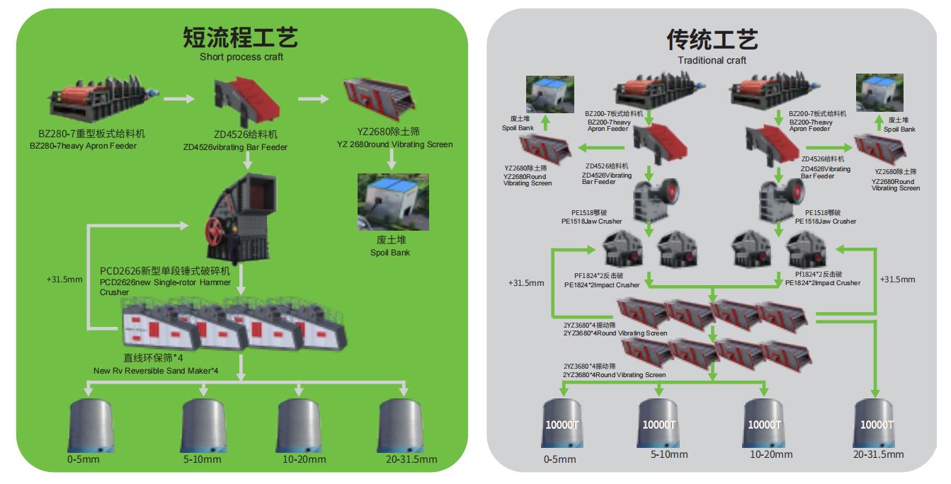 項目生產線采用鑫金山特有的高效節能短流程工藝,實現傳統多臺破碎機的產量,破碎比大,一次成型率高達80%的特性,生產工藝中無需配置回料破,進一步節約了場地與能耗,大幅減少配套設備、土建、非標、鋼構、電氣等投入。同時,揚塵點與檢修點也相應減少,降低了環保與檢修壓力。