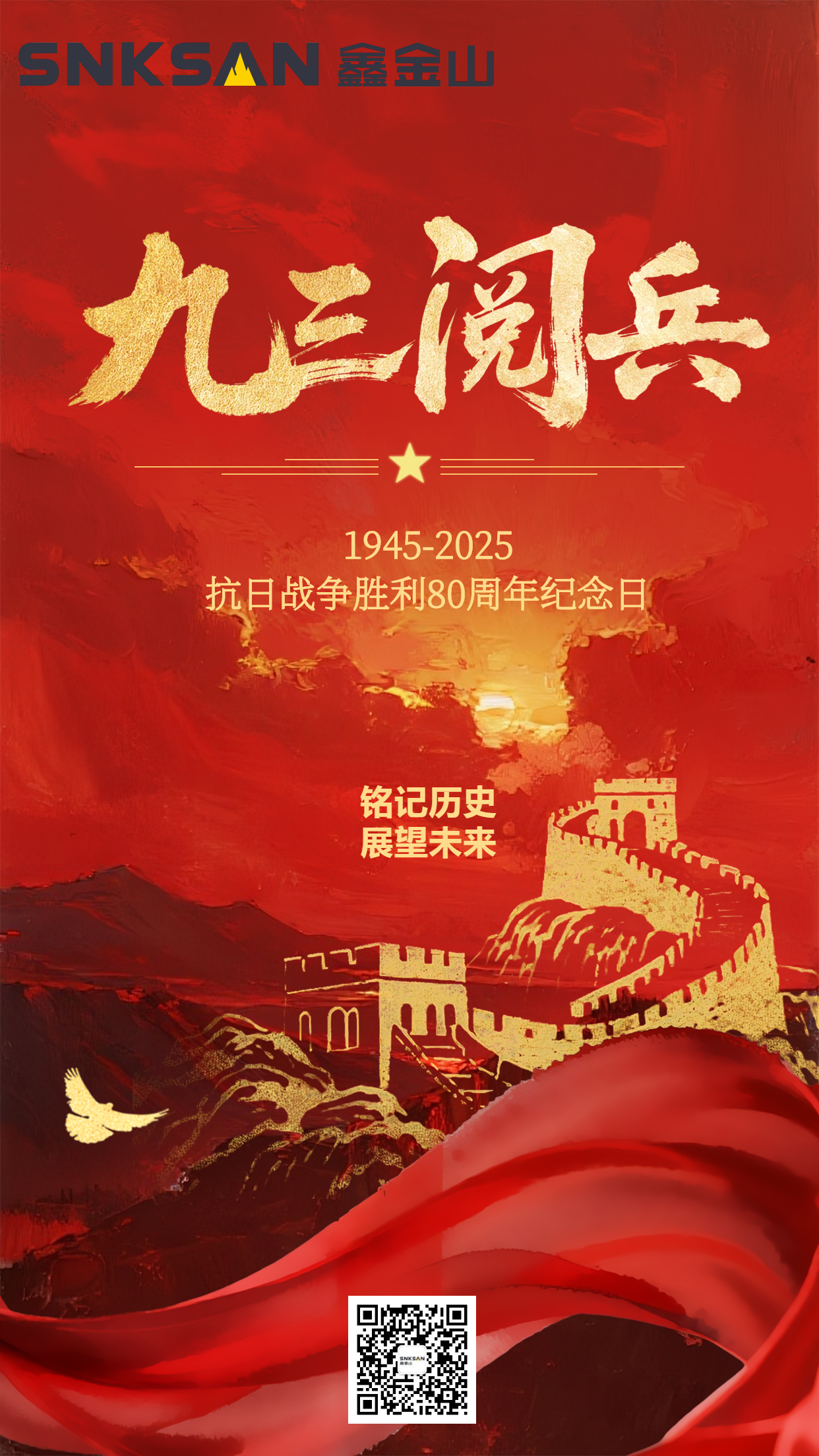 2025 年 9 月 3 日,我們迎來中國人民抗日戰爭暨世界反法西斯戰爭勝利 80 周年的光輝時刻。80 載時光荏苒,鐫刻著中華民族在烽火中挺立的不屈脊梁,也見證著華夏兒女賡續精神、砥礪前行的奮斗征程。鑫金山作為深耕破碎裝備領域的重工企業,始終與祖國發展同頻共振,既銘記歷史中先輩們的無畏擔當,也深知當代工業人肩負的使命。在這意義非凡的時刻,鑫金山回望崢嶸歲月、錨定未來航向,以精益求精的破碎技術、堅韌不拔的制造匠心,向偉大勝利致敬,為民族工業振興注入強勁動能,讓重工力量與民族精神同輝。