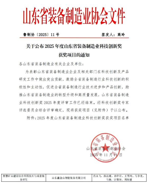 山東省裝備制造業(yè)科技創(chuàng)新獎是全省裝備制造行業(yè)科技創(chuàng)新的最高榮譽之一,旨在表彰在技術(shù)研發(fā)、產(chǎn)品創(chuàng)新中作出突出貢獻的企業(yè)與項目,助力全省裝備制造業(yè)轉(zhuǎn)型升級與高質(zhì)量發(fā)展。本次評選經(jīng)專家評審委員會嚴苛審核,從數(shù)百個申報項目中擇優(yōu)遴選,鑫金山憑借扎實的技術(shù)積累、突破性的創(chuàng)新成果,成功躋身一等獎榜單,彰顯了公司在礦山裝備領(lǐng)域的硬核實力。