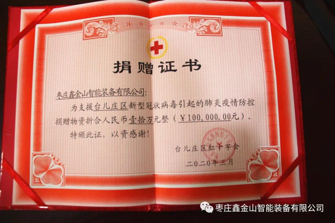 導讀:3月28日上午,棗莊鑫金山智能裝備有限公司向棗莊市臺兒莊區紅十字會捐贈價值10萬元的防疫物資,用于新型冠狀病毒肺炎疫情的防控工作,以實際行動踐行企業的責任和擔當,為抗擊疫情貢獻一份力量。