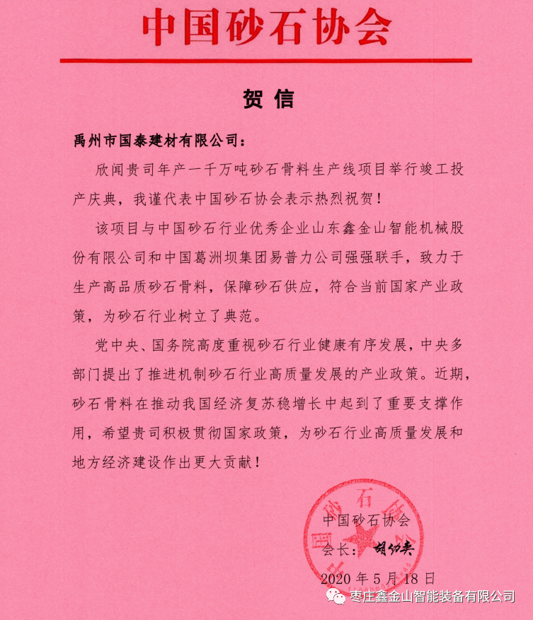 竣工儀式上,棗莊鑫金山智能裝備有限公司董事長(zhǎng)孫中巖以中國(guó)砂石協(xié)會(huì)副會(huì)長(zhǎng)單位名義宣讀中國(guó)砂石協(xié)會(huì)胡幼奕會(huì)長(zhǎng)賀信。首先,胡會(huì)長(zhǎng)在賀信中指出,對(duì)禹州市國(guó)泰建材有限公司年產(chǎn)一千萬噸砂石骨料生產(chǎn)線項(xiàng)目竣工投產(chǎn)表示祝賀。并表示,該項(xiàng)目致力于生產(chǎn)高品質(zhì)砂石骨料,保障砂石供應(yīng),符合當(dāng)前guojia產(chǎn)業(yè)政策,為砂石行業(yè)樹立了典范。