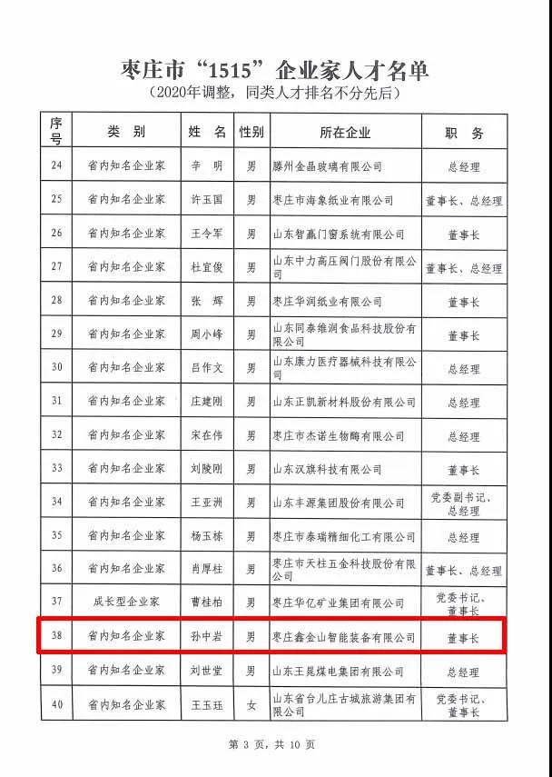 導(dǎo)讀:近日,從棗莊市工業(yè)和信息化局傳來(lái)喜訊,正式公示了2020年棗莊市龍頭骨干工業(yè)企業(yè)和創(chuàng)新成長(zhǎng)型工業(yè)企業(yè)名單以及棗莊市“1515”企業(yè)家人才名單,棗莊鑫金山智能裝備有限公司榜上有名,成功榮獲“棗莊市龍頭骨干企業(yè)”殊榮,董事長(zhǎng)孫中巖榮獲棗莊市“1515”企業(yè)家榮譽(yù)稱號(hào)。
