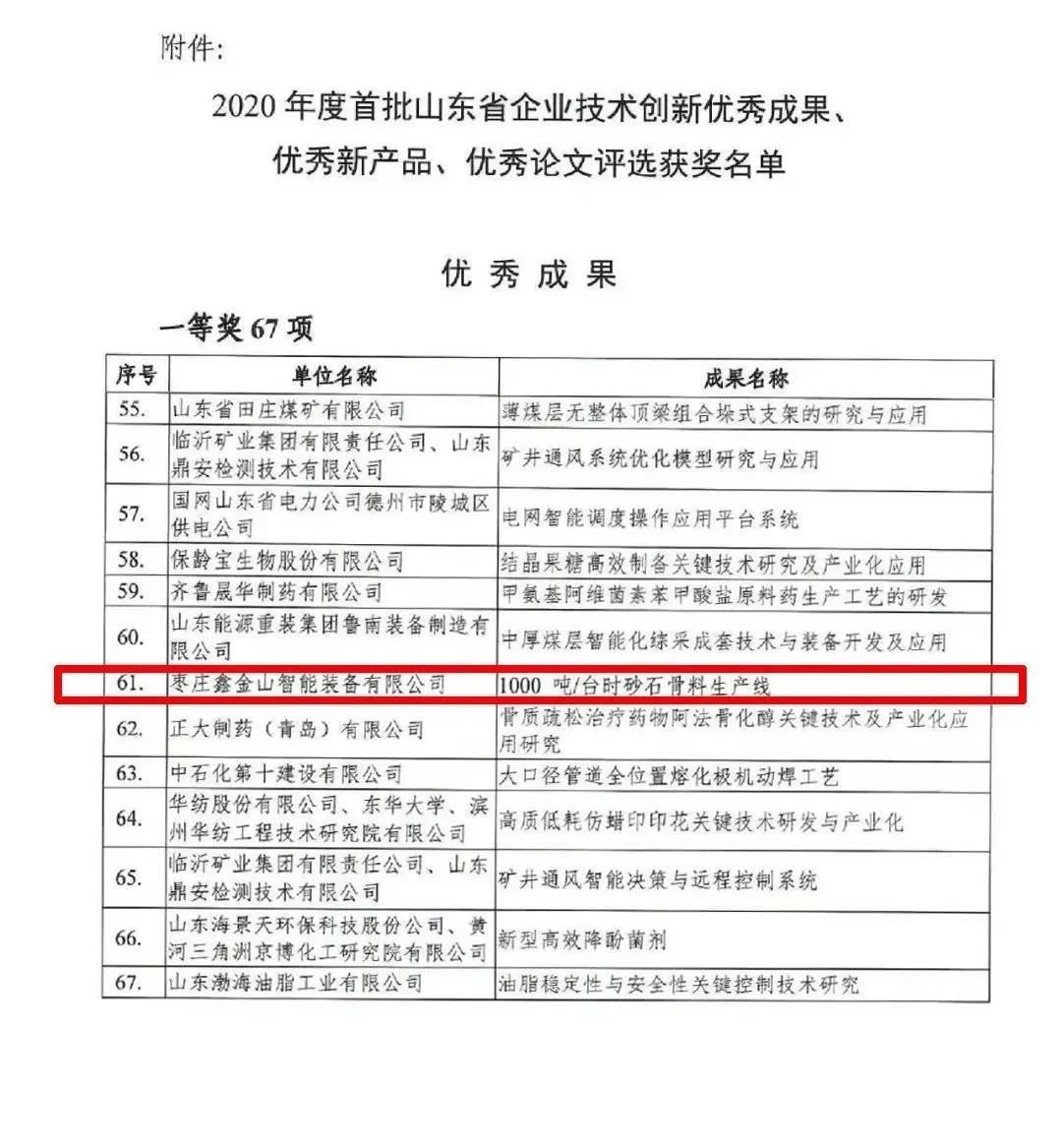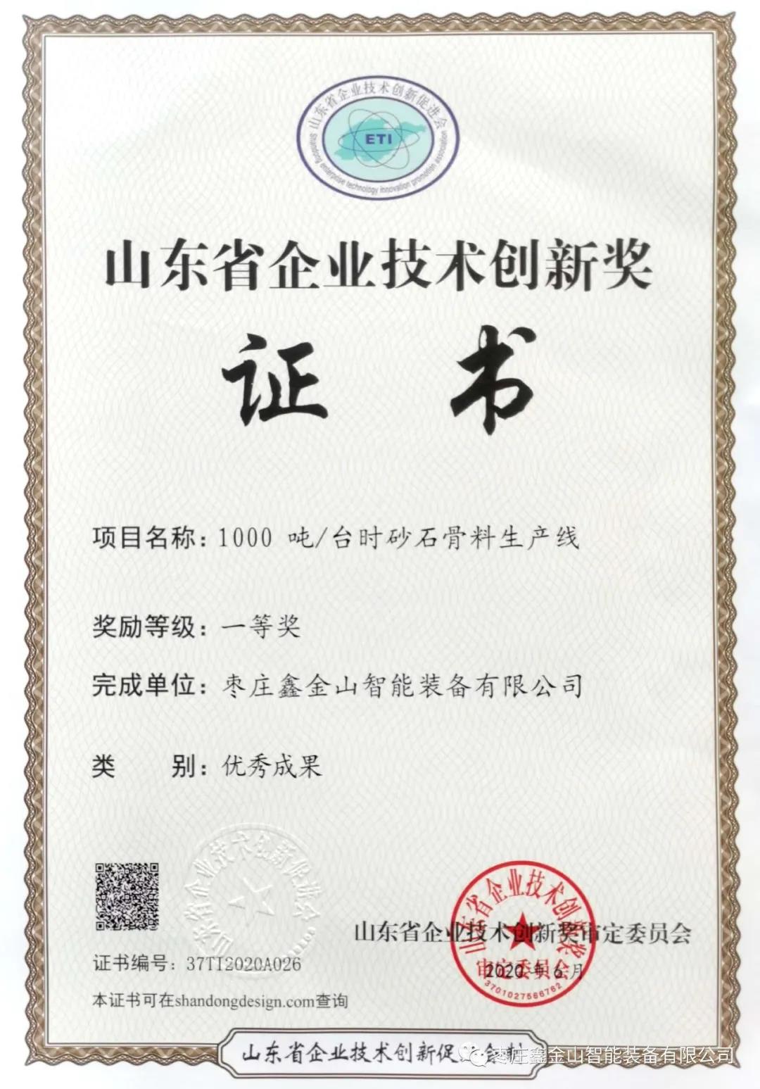 導(dǎo)讀:近日,從山東省企業(yè)技術(shù)創(chuàng)新促進會傳來喜訊,正式公布2020年首批山東省企業(yè)技術(shù)創(chuàng)新優(yōu)秀成果、優(yōu)秀新產(chǎn)品、優(yōu)秀論文評選結(jié)果名單,棗莊鑫金山智能裝備有限公司研發(fā)打造的“1000噸/臺時砂石骨料生產(chǎn)線”,成功獲評優(yōu)秀成果一等獎。