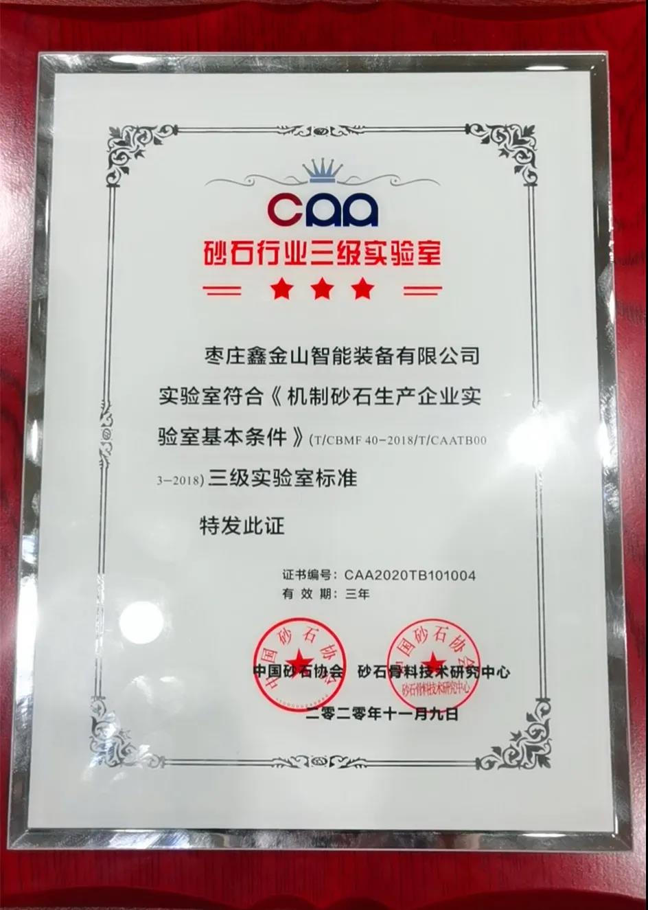 14日當天,為表彰優秀、樹立典范,引領和推動行業向著更高層次發展。在中國砂石協會年會現場進行了一系列盛大的頒獎儀式。儀式上,棗莊鑫金山智能裝備有限公司實驗室被評定為砂石行業三級(zui高等級)實驗室,董事長孫中巖入選綠色礦山建設專家庫專家。