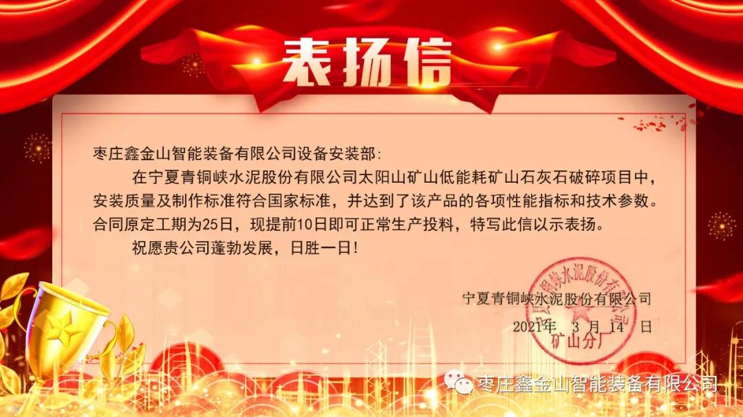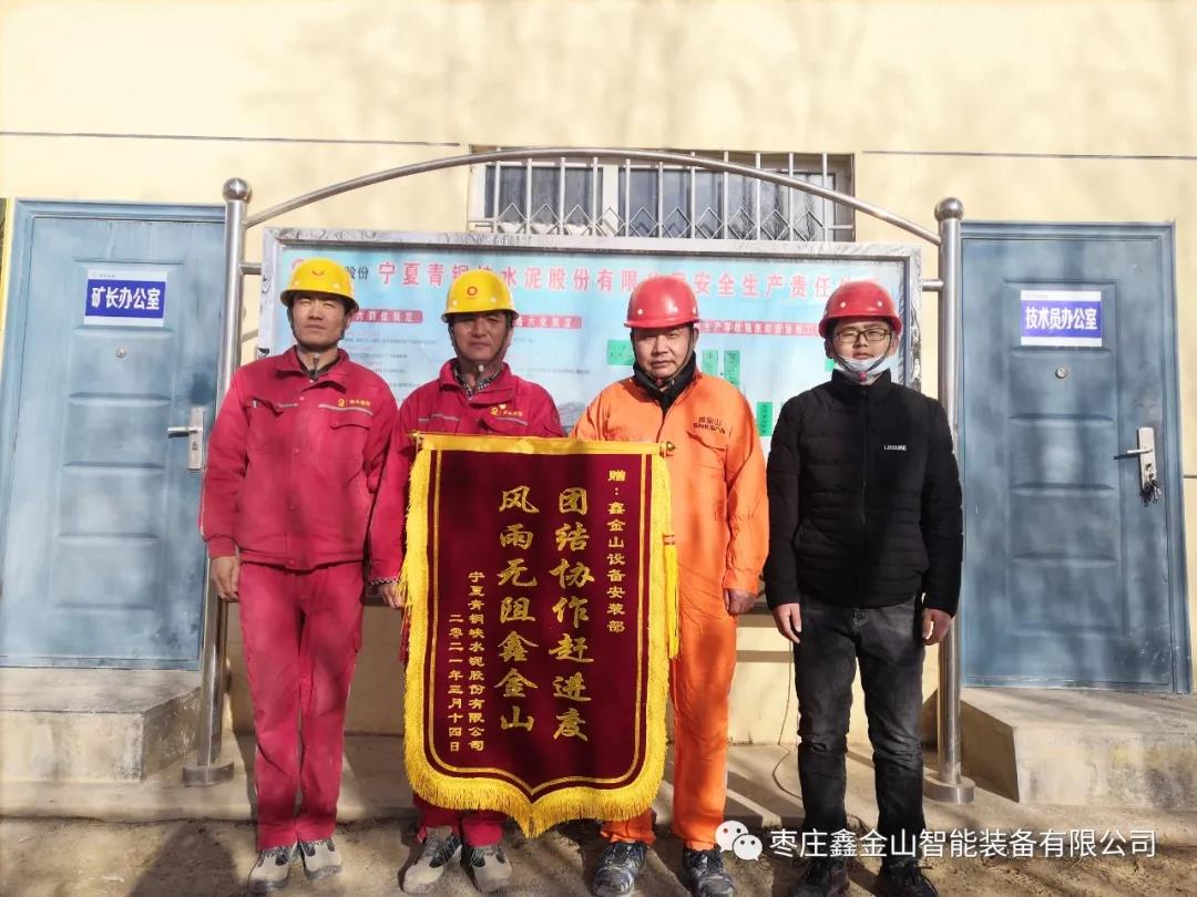 近日,鑫金山公司收到來自寧夏青銅峽水泥股份有限公司贈送的“團結協作趕進度,風雨無阻鑫金山”的錦旗與表揚信。感謝鑫金山公司設備安裝部在寧夏青銅峽水泥太陽山礦山低能耗礦山石灰石破碎項目中提供的優質服務,并對團隊加班加點、保質保量提前完成施工任務的工匠精神給予了高度評價。再次充分彰顯了客戶對鑫金山公司優質高效服務的信任與認可。