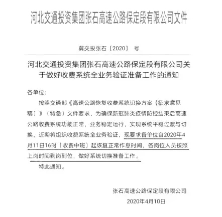 河北張石高速公路保定段有限公司通知:4月11日16時(收費中班)起恢復正常作息時間,各崗位人員按照上崗時間到崗到位,做好系統切換準備工作。